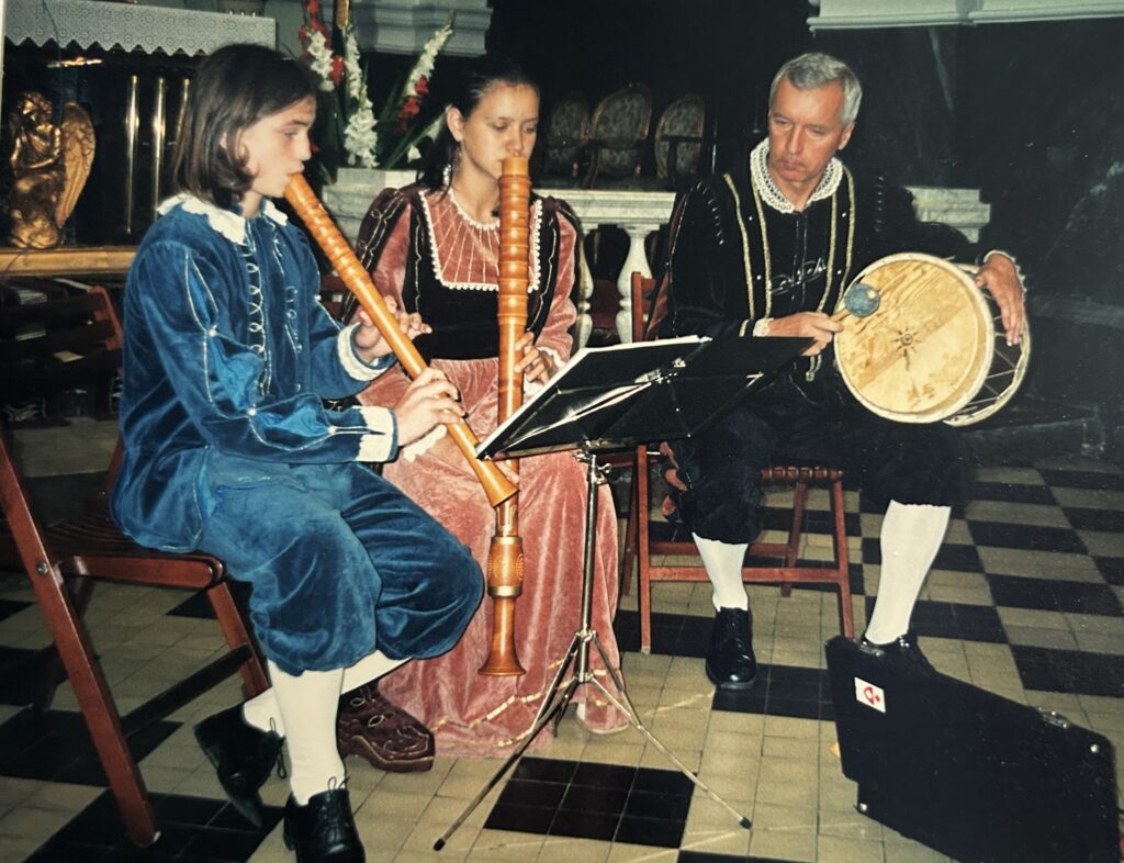 Muzycy wykonuja muzykę na kopiach instrumentów z epoki