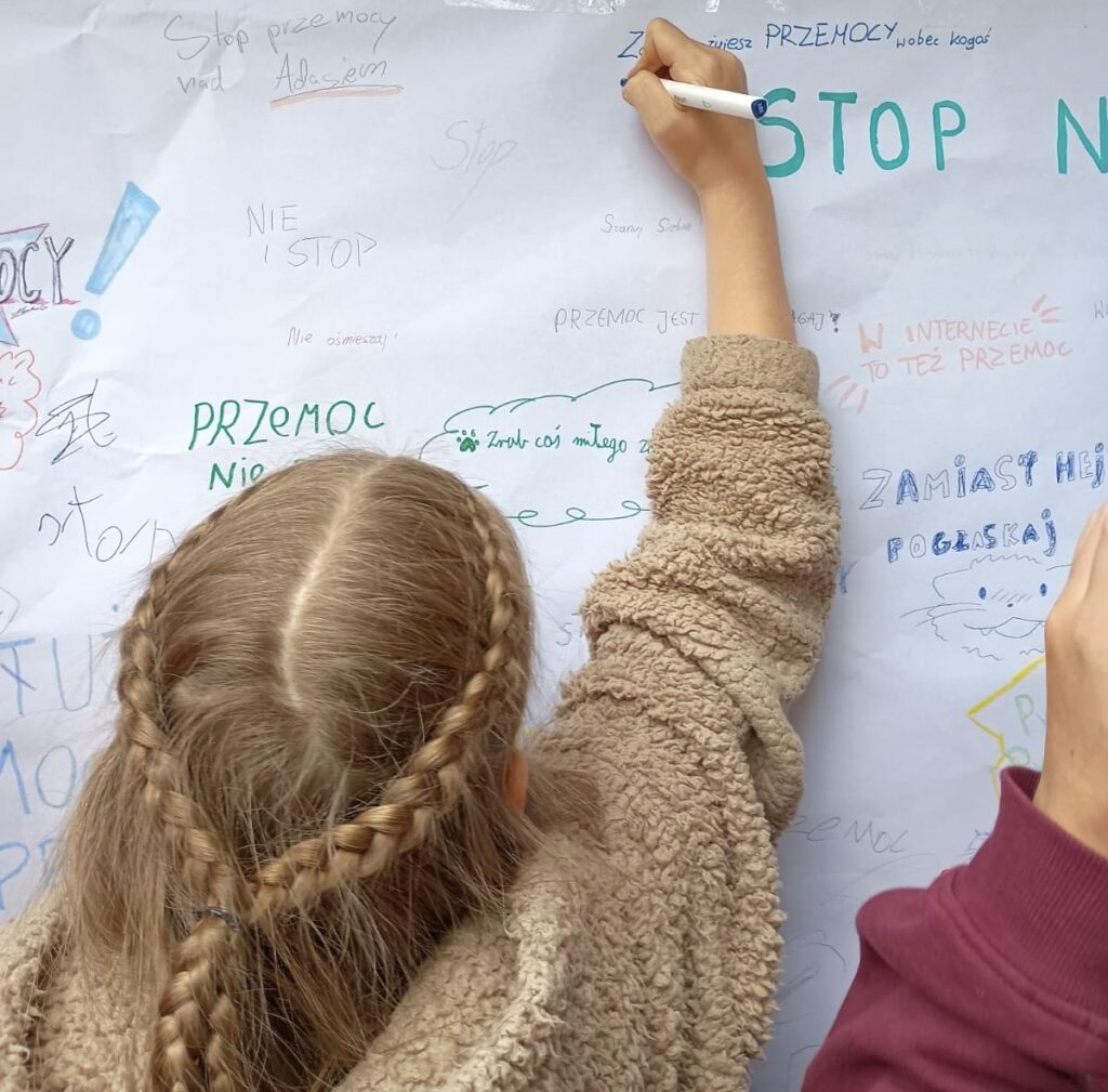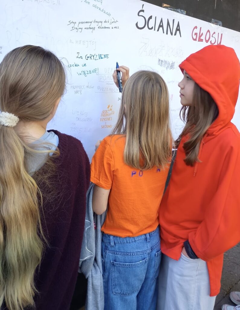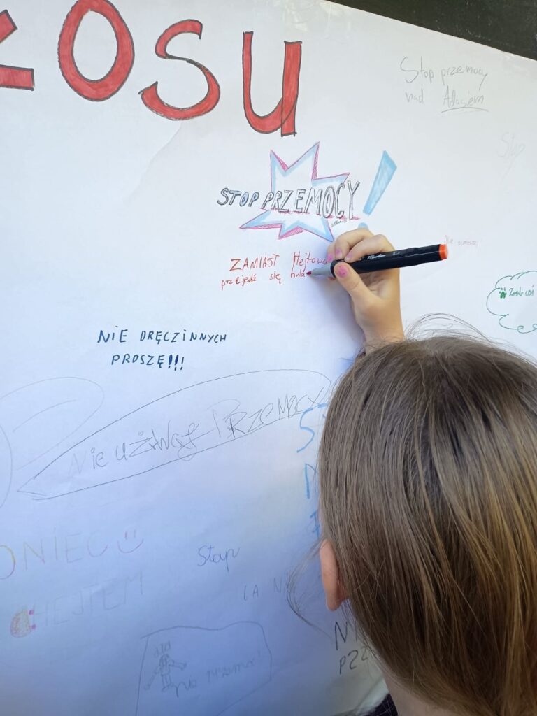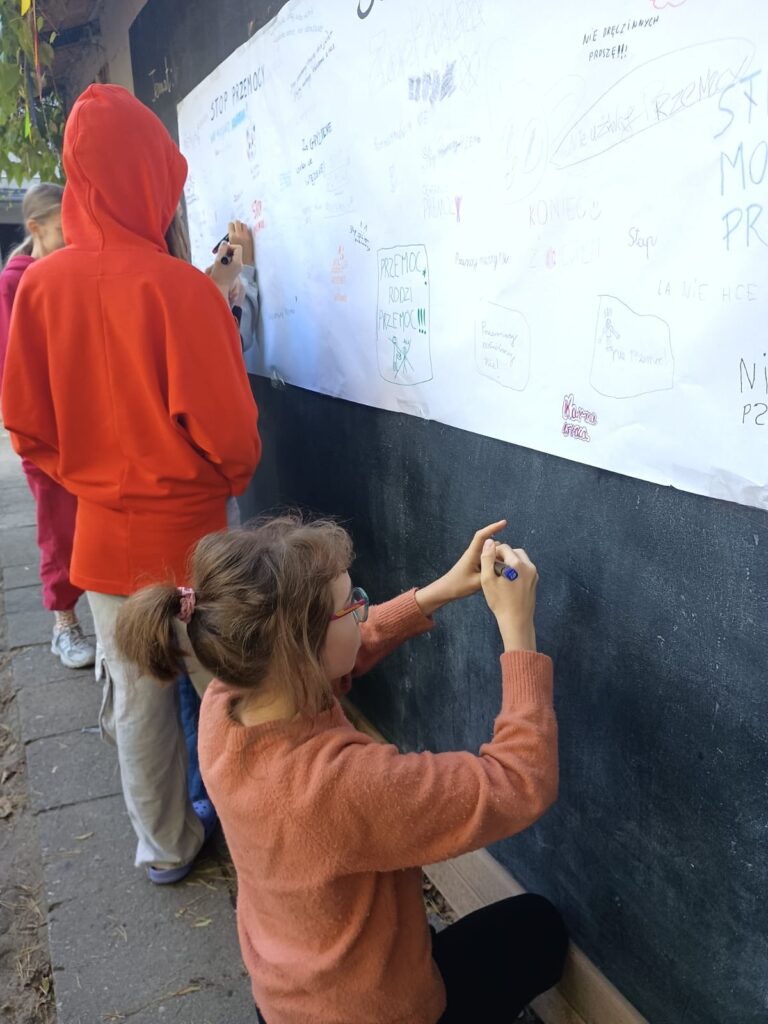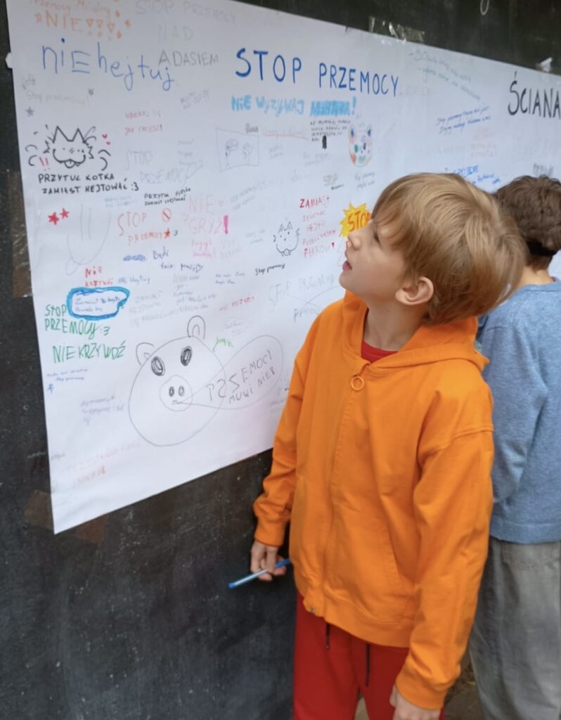 Dzięki takim działaniom przypominamy, że szkoła jest miejscem wolnym od przemocy, a wspólne zaangażowanie uczniów i nauczycieli pomaga budować atmosferę życzliwości, wsparcia i bezpieczeństwa.