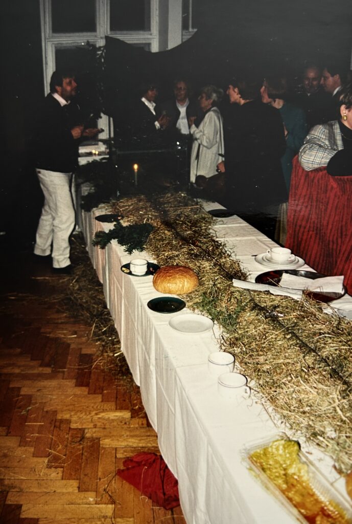 Przy suto zastanawianym stole, łamiąc się opłatkiem, w atmosferze świątecznych życzeń wspólnie kolędowaliśmy.